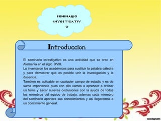El seminario investigativo es una actividad académica que tuvo su origen en Alemania a finales del siglo XVIII. Es un grupo de personas que se reúne para conversar y compartir los logros y hallazgos de su investigación sobre un tema específico. El seminario permite analizar un tema desde diferentes puntos de vista a través de la exposición, complementación y evaluación del tema por parte de los participantes, lo que lleva a nuevas conclusiones y preguntas.