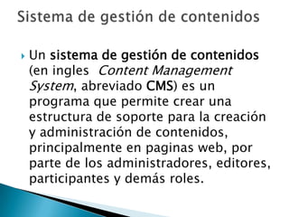 El documento describe los sistemas de gestión de contenidos (CMS), los cuales permiten crear y administrar contenido web de manera estructurada. Un CMS consiste en una interfaz que controla bases de datos donde se almacena el contenido de un sitio web, permitiendo separar el contenido del diseño y publicar contenido de manera fácil y controlada. Los primeros CMS fueron desarrollados por organizaciones que publicaban grandes cantidades de contenido en línea.