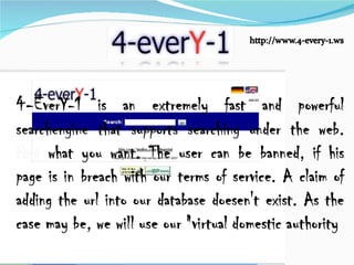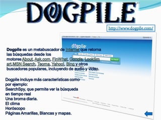 Google es el mejor buscador del mundo debido a su avanzada combinación de hardware y software, mientras que Yahoo ofrece una amplia gama de servicios como búsqueda, noticias, correo electrónico y mensajería. Live.com permite encontrar varios tipos de contenido como videos, fotos y noticias a través de un buscador de imágenes mejorado, y MetaCrawler realiza búsquedas simultáneas en múltiples motores de búsqueda como Google, Yahoo y MSN.
