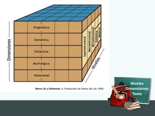 El documento describe los diferentes niveles y dimensiones de un texto. Explica que un texto tiene un contenido y una forma, y que existen cinco niveles de análisis de un texto: superestructural, macroestructural, microestructural, estilístico y retórico. También describe las cinco dimensiones de un texto: pragmática, semántica, sintáctica, morfológica y notacional.