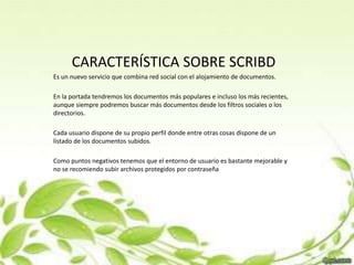 El documento resume las características de varias plataformas como Scribd, SlideShare, Issuu, YouTube y Flickr. Scribd permite compartir documentos y crear perfiles de usuario. SlideShare permite subir y compartir presentaciones. Issuu permite crear libros y revistas de forma gratuita pero es lento. YouTube permitirá enlaces a plataformas de crowdfunding y una biblioteca de audio gratuita. Flickr permite clasificar fotos con etiquetas y publicarlas en álbumes de forma privada o pública.