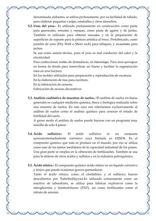 El documento presenta un informe de investigación de campo y análisis de muestras de yeso realizado por estudiantes. La investigación incluyó una visita al cerro Pan de Azúcar para recolectar muestras de suelo y observaciones cualitativas. En el laboratorio, se analizaron las muestras para determinar la presencia de materia orgánica, agua y minerales mediante pruebas de calcinación y reacciones ácidas. Los resultados mostraron evidencia de materia orgánica, un 20% de agua y reacciones