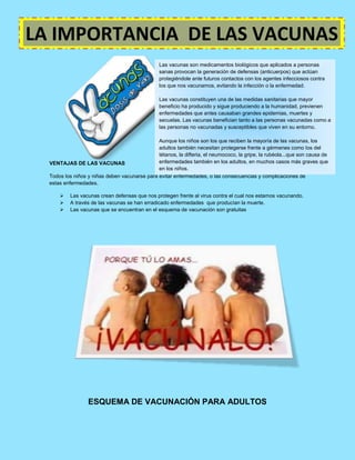 Las vacunas son medicamentos biológicos que generan defensas para proteger contra enfermedades infecciosas, previniendo epidemias, muertes y secuelas. Aunque los niños reciben la mayoría de vacunas, los adultos también necesitan protección contra enfermedades como el tétanos, la difteria y la gripe. El esquema de vacunación para adultos incluye dosis regulares de vacunas contra la difteria, el tétanos, la influenza y neumococo, así como vacunas únicas contra hepatitis, fiebre tifo