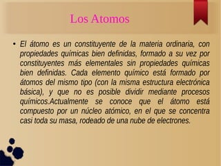 El documento describe la estructura de los átomos y las moléculas. Explica que los átomos son la unidad básica de la materia y están compuestos de protones, neutrones y electrones. Las moléculas están formadas por al menos dos átomos unidos covalentemente y pueden estar compuestas de uno o más elementos químicos diferentes.