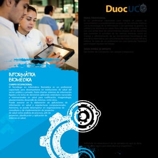 El documento presenta la carrera de Tecnólogo en Informática Biomédica de Duoc UC. El programa forma profesionales capaces de integrar conocimientos médicos y de tecnologías de la información para optimizar la gestión y calidad en salud. Los estudiantes aprenden sobre sistemas de información en salud, desarrollo de aplicaciones médicas, y pueden desempeñarse en instituciones públicas y privadas de salud o empresas de consultoría. El programa dura 4 años y incluye cursos de anatomía, programación, bases