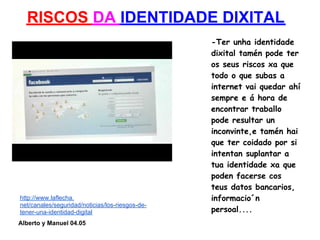 La identidad digital conlleva tanto beneficios como riesgos. Entre los beneficios se encuentran la posibilidad de socializar y comunicarse con otros, facilitar la búsqueda de empleo y mostrar productos o servicios. Sin embargo, también existen riesgos como la usurpación de identidad, ciberacoso, ciberadicción y la pérdida de privacidad. Por lo tanto, es importante ser consciente de los riesgos de publicar información personal en internet y tomar las precauciones necesarias para proteger la propia identidad digital.
