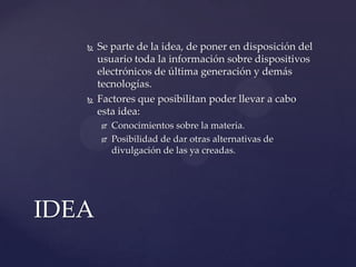 Este documento presenta una idea para crear un sitio web y canal de YouTube sobre noticias e información de dispositivos electrónicos y tecnología. El proyecto utilizaría estas plataformas para divulgar conocimientos sobre gadgets y novedades tecnológicas, atrayendo a personas interesadas en electrónica a través de foros en internet. Se analiza el mercado objetivo, recursos requeridos y posibles ingresos a través de anuncios o donaciones.