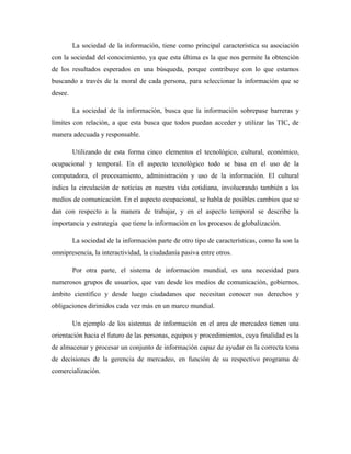 El documento describe las características de la sociedad de la información y cómo está relacionada con la sociedad del conocimiento. Explica que la sociedad de la información busca que todos puedan acceder y usar las TIC de manera responsable, utilizando elementos tecnológicos, culturales, económicos, ocupacionales y temporales. También discute que los sistemas de información son necesarios para grupos como los medios, gobiernos y ciudadanos, y provee el ejemplo de cómo los sistemas de información de mercadeo almacenan datos