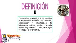 La Informática Jurídica es una ciencia que estudia el tratamiento de la información jurídica a través del análisis, organización y clasificación de normas y textos legales desde una perspectiva informática. Permite el desarrollo del derecho de forma más actualizada considerando el contexto cibernético e implica el análisis de contenido y métodos de clasificación de la información jurídica.