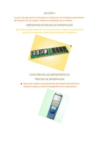El documento describe los principales componentes de una computadora PC, incluyendo el microprocesador, la tarjeta madre, la memoria RAM y la tarjeta de video. Explica que el microprocesador es el elemento más importante y describe los diferentes tipos de microprocesadores de Intel, AMD y VIA. También describe la estructura y función de la tarjeta madre, los diferentes tipos de memoria RAM y las características y tipos de tarjetas de video.