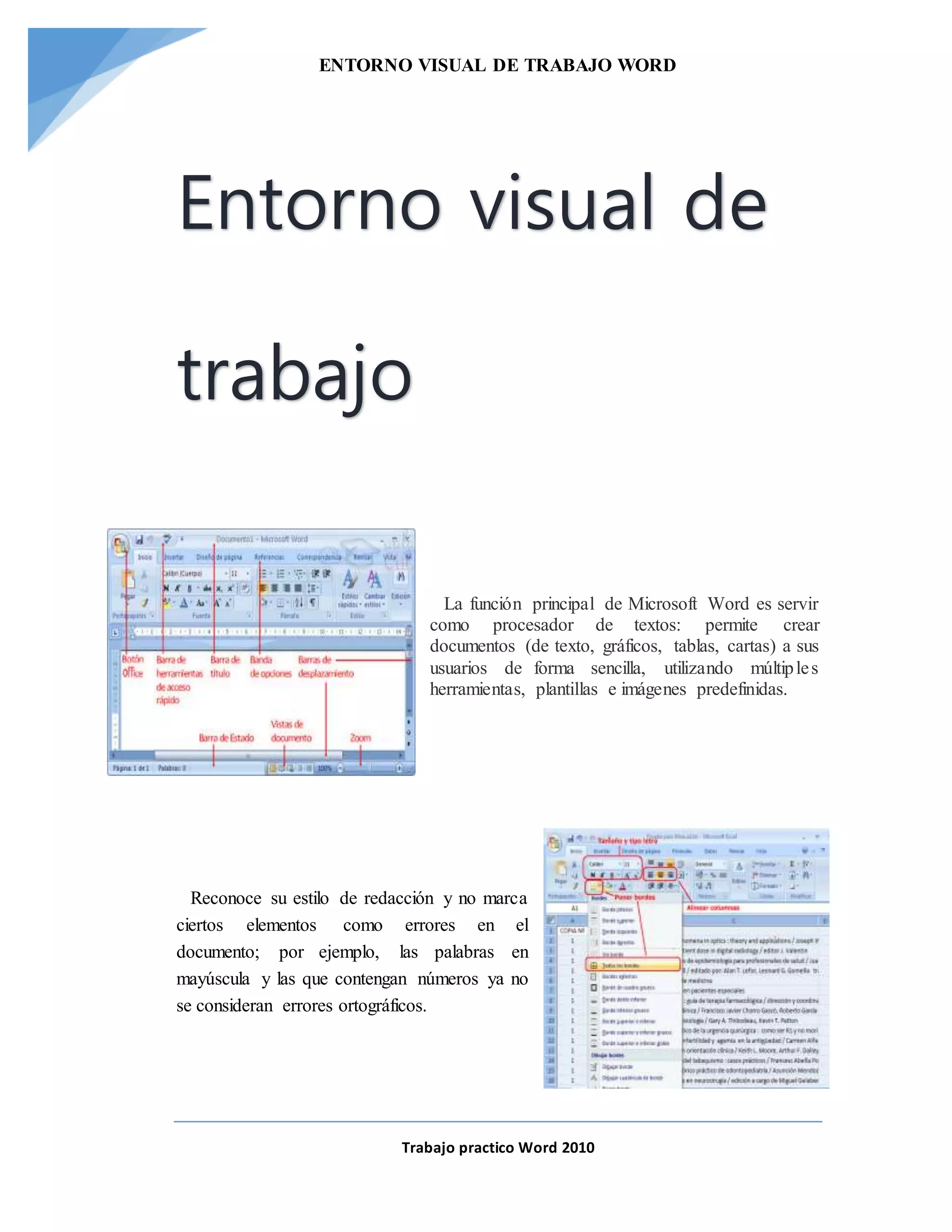 El documento describe la historia y el entorno visual de trabajo de Microsoft Word. Comenzó como un programa rudimentario en 1983 y ha evolucionado a través de las versiones para ser el procesador de texto más utilizado actualmente. La versión más reciente es Microsoft Word 2013, que se destaca por ser la primera diseñada especialmente para dispositivos táctiles.