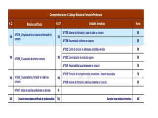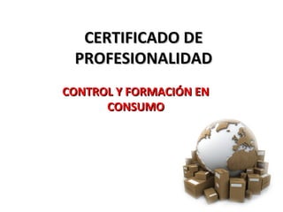 Este documento proporciona información sobre certificados de profesionalidad y control y formación en consumo. Explica que un certificado de profesionalidad acredita una cualificación profesional del catálogo nacional y lo expiden el servicio público de empleo y órganos autonómicos. También describe las diferentes fuentes de información sobre consumo a nivel internacional, europeo, nacional y autonómico como Eurostat, el Instituto Nacional del Consumo y las fuentes ministeriales.