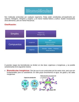 Este documento trata sobre las biomoléculas orgánicas e inorgánicas. Explica que las biomoléculas se dividen en orgánicas e inorgánicas, y describe los glúcidos como un tipo importante de biomolécula orgánica. Los glúcidos se clasifican en monosacáridos, disacáridos y polisacáridos, e identifica algunos ejemplos clave de cada tipo como la glucosa, la sacarosa y el almidón. También discute las funciones y usos de los glúcidos en