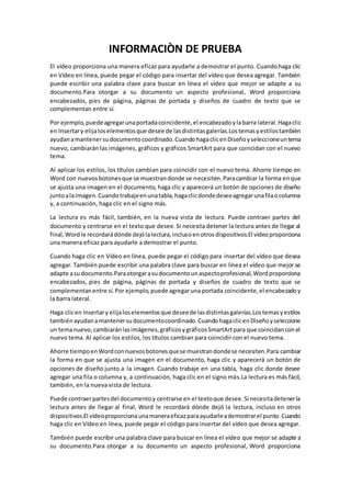 El documento describe las diferentes funciones de Microsoft Word que permiten mejorar la presentación y lectura de documentos, incluyendo la inserción de videos, temas, encabezados, pies de página y diseños de cuadros de texto. También explica cómo Word facilita la edición de tablas, imágenes y la navegación en la vista de lectura.