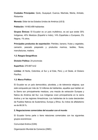 Este documento presenta un estudio de mercado del Ecuador. Su objetivo es conocer las características esenciales del estudio de mercado del país, incluyendo la información básica, indicadores socioeconómicos y políticos, y los principales países de importación y exportación. Analiza la balanza comercial del Ecuador, la evolución de sus exportaciones, y los sectores y productos con mayor potencial de exportación no tradicional.