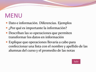 Este documento describe las diferencias entre datos e información, la importancia de la información, y las 10 operaciones básicas que permiten transformar datos en información. Explica que los datos son elementos aislados mientras que la información son datos procesados y relacionados de manera significativa. Luego detalla cada una de las 10 operaciones como captar, verificar, clasificar, ordenar, sumar, calcular, almacenar, recuperar, reproducir y distribuir/comunicar. Finalmente, enumera las operaciones necesarias para confeccionar una lista con el nombre, ap