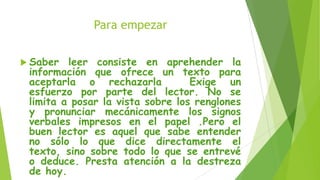 Este documento discute la diferencia entre información explícita e implícita en un texto. Explica que la información explícita son las ideas que el autor transmite de forma directa, mientras que la información implícita son ideas que el lector debe inferir. Luego, analiza un ejemplo concreto y extrae 3 ideas explícitas y 3 implícitas del texto.