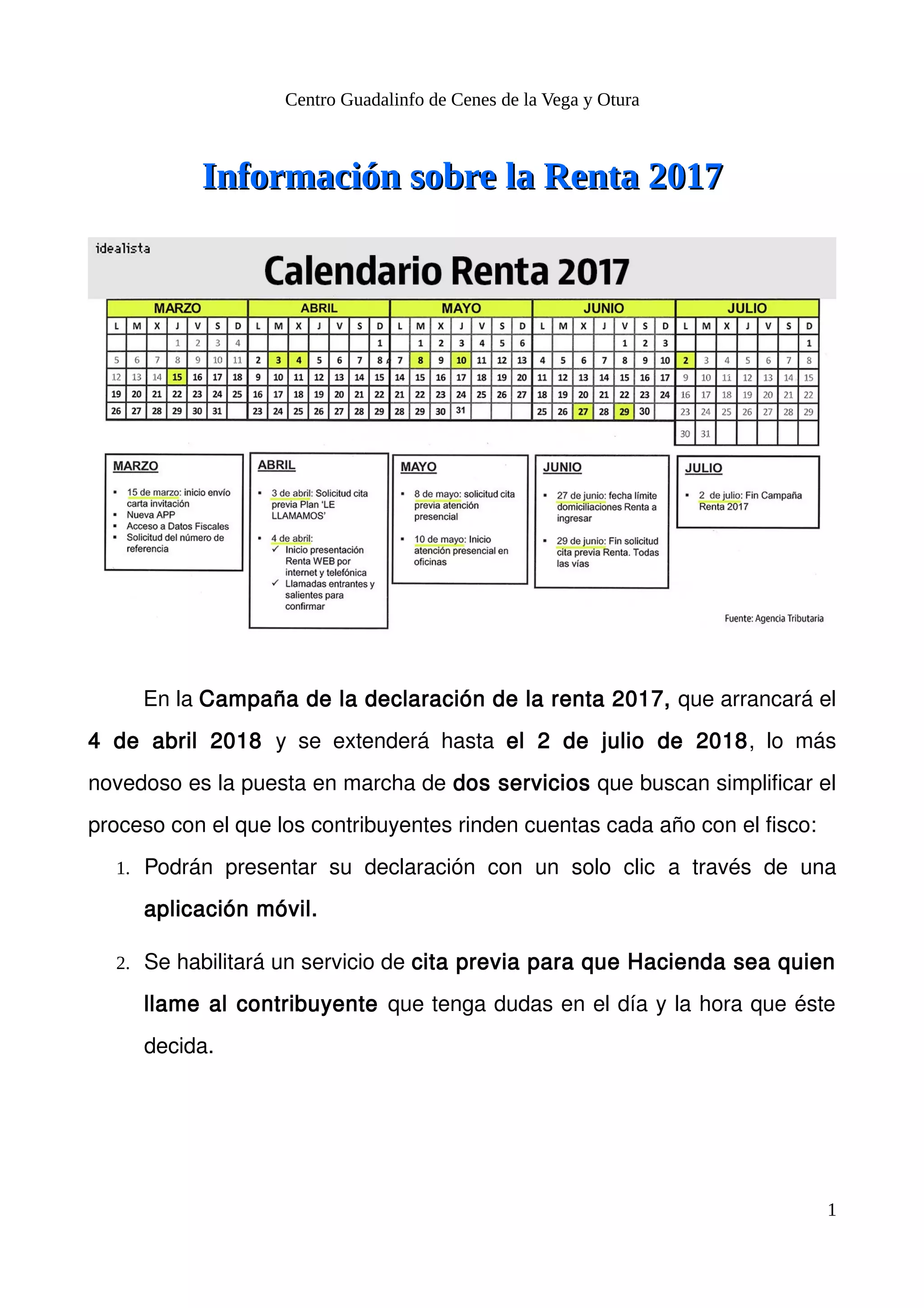 La campaña de la renta 2017 introducirá dos novedades principales: 1) una aplicación móvil que permitirá presentar la declaración con un solo clic para contribuyentes con declaraciones sencillas, y 2) un servicio de cita previa para que la Agencia Tributaria llame al contribuyente el día y hora elegidos para resolver dudas. La campaña se llevará a cabo del 4 de abril al 2 de julio de 2018.