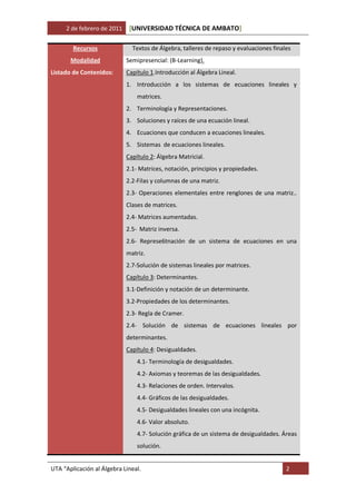 Este documento presenta un módulo sobre la aplicación del álgebra lineal. El módulo tiene como objetivo general que los estudiantes y docentes usen los conceptos y herramientas del álgebra lineal como ecuaciones, matrices, determinantes para resolver problemas. El módulo se dividirá en cinco capítulos que cubren introducción al álgebra lineal, álgebra matricial, determinantes, desigualdades y programación lineal. El módulo se impartirá de manera semipresencial utilizando textos, talleres