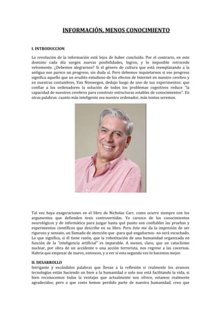 El documento discute el impacto de la revolución de la información y la tecnología en la capacidad cognitiva y de atención de la humanidad. Se plantea la preocupación de que el uso excesivo de la tecnología pueda disminuir nuestra capacidad de lectura y análisis, mientras que el contacto con libros físicos sigue siendo valioso. La virtualidad ofrece nuevas oportunidades para la educación, pero su implementación debe ser estratégica para mejorar el aprendizaje.