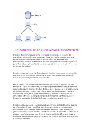 Los sistemas de gestión de documentos son programas que permiten el almacenamiento y recuperación de grandes cantidades de documentos electrónicos o imágenes digitalizadas. Estos sistemas proporcionan medios de almacenamiento, seguridad e indexación para permitir el acceso rápido a la información contenida en los documentos. El tratamiento documental es el proceso de describir y representar sistemáticamente los documentos para facilitar su recuperación a través de la clasificación, indización y extracción de términos clave.