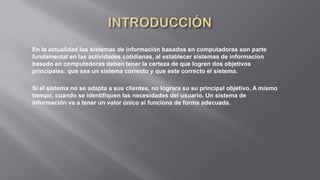 Este documento discute el análisis y diseño de sistemas de información. Explica que el análisis implica estudiar la situación actual para determinar si se necesitan mejoras, mientras que el diseño define los componentes y la arquitectura del sistema. También describe varias etapas clave en el ciclo de vida de un sistema, como la planificación, el análisis, el diseño e implementación.