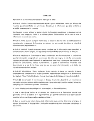 Este documento define los conceptos y regula el uso del comercio electrónico y las firmas digitales en Colombia. Define términos como mensaje de datos, comercio electrónico y firma digital. Establece que los mensajes de datos cumplen con los requisitos de escritura y firma, y que son admisibles como prueba. Regula aspectos como la formación de contratos electrónicos, la atribución y presunción del origen de mensajes, y el acuse de recibo. También regula las entidades de certificación y los requisitos de los cert