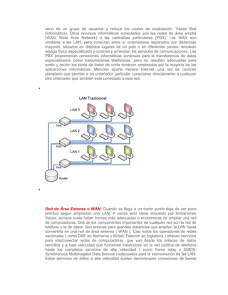 El documento describe las redes de interconexión y sus componentes. Las redes de interconexión permiten que diferentes redes se comuniquen entre sí de forma transparente para el usuario. Los dispositivos de interconexión como conmutadores, concentradores y enrutadores superan las limitaciones físicas de una red y permiten la extensión y compartición de recursos entre redes.