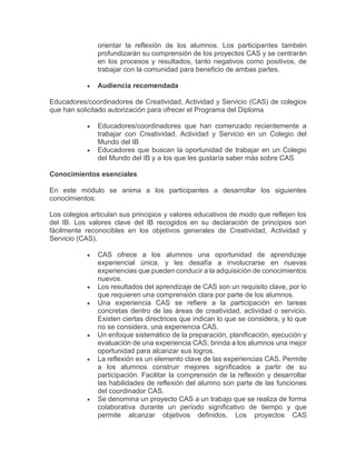 Este taller proporcionará a los participantes una comprensión de los fundamentos de Creatividad, Actividad y Servicio (CAS) y su lugar en el Programa del Diploma. Explorará los requisitos de CAS para estudiantes, personal y escuelas, y dotará a los participantes de herramientas para diseñar, mantener y mejorar CAS. El taller también mejorará la capacidad de los participantes para apoyar a los estudiantes en CAS a través del desarrollo de proyectos y la reflexión. La audiencia recomendada incluye coordinadores de