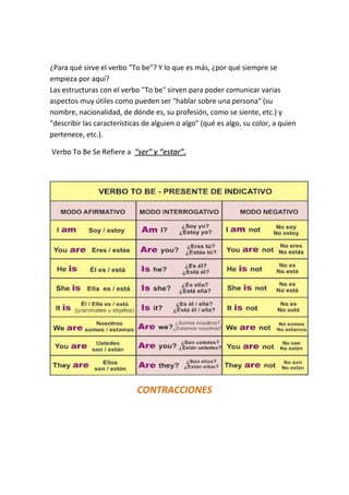 Este documento presenta información sobre el verbo "to be" en inglés y otros verbos como "do" y "does". Explica el uso del verbo "to be" para describir características y hablar sobre personas. Luego proporciona ejemplos de conjugaciones con "to be" y ejercicios para practicar. También cubre el uso de "do" y "does" en preguntas y oraciones negativas en inglés. Finalmente, incluye secciones de información personal y ejercicios de práctica relacionados con verbos y datos personales.