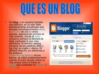 Un blog es un sitio web actualizado periódicamente que recopila artículos de uno o más autores de forma cronológica, con las entradas más recientes primero. Los blogs permiten a los autores publicar libremente lo que consideren pertinente. Para crear un blog, se necesita una cuenta en páginas web gratuitas como Blogger o WordPress, que requieren un correo electrónico, contraseña y nombre de usuario. Los blogs deben actualizarse diariamente con al menos 3 nuevas entradas para mantener el tráfico y retener a los lectores.