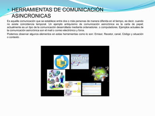 Este documento describe diferentes herramientas de comunicación como la comunicación asincrónica (ej. correo electrónico), sincrónica (ej. chat), mensajería interna y correo electrónico. Explica que la comunicación asincrónica no requiere coincidencia temporal entre emisor y receptor, mientras que la comunicación sincrónica es en tiempo real. También describe los elementos clave del correo electrónico como el agente de usuario, agente de transporte y agente de entrega involucrados en el envío de mensajes, así como los componentes comunes de