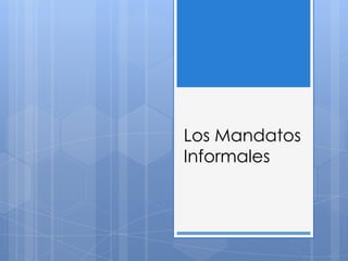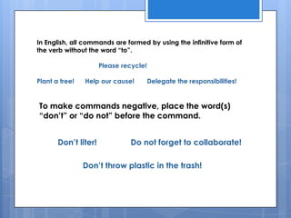 Este documento explica cómo formar mandatos informales en español. Los mandatos positivos se forman usando la forma "tú" del presente y quitando la -s. Los mandatos negativos se forman con "no" más la forma "yo" del presente con cambios de terminación. También cubre verbos reflexivos, irregulares y algunas excepciones ortográficas.