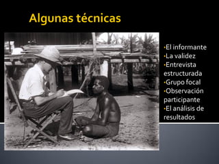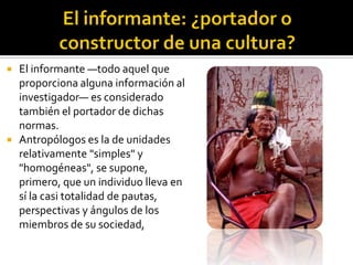 Este documento discute diferentes aspectos de la metodología cualitativa en antropología. Aborda temas como la importancia de considerar la subjetividad del investigador y los informantes, la búsqueda de significados más que sólo hechos, y el uso de métodos como la observación participante para comprender las distancias entre lo que se piensa, dice y hace. Resalta la necesidad de interpretar en lugar de sólo describir, y analizar el contexto social que influye en la información obtenida.