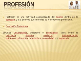 Este documento describe diferentes profesiones y sus características. Explica que una profesión es una actividad especializada del trabajo que requiere una formación específica como estudios universitarios. Detalla algunas de las profesiones más importantes como diferentes tipos de ingeniería, medicina, psicología, ciencias sociales y sus funciones. También identifica algunas de las profesiones con mayor demanda en el futuro que incluyen ingeniería ambiental, biotecnología, robótica, medicina y psicología.