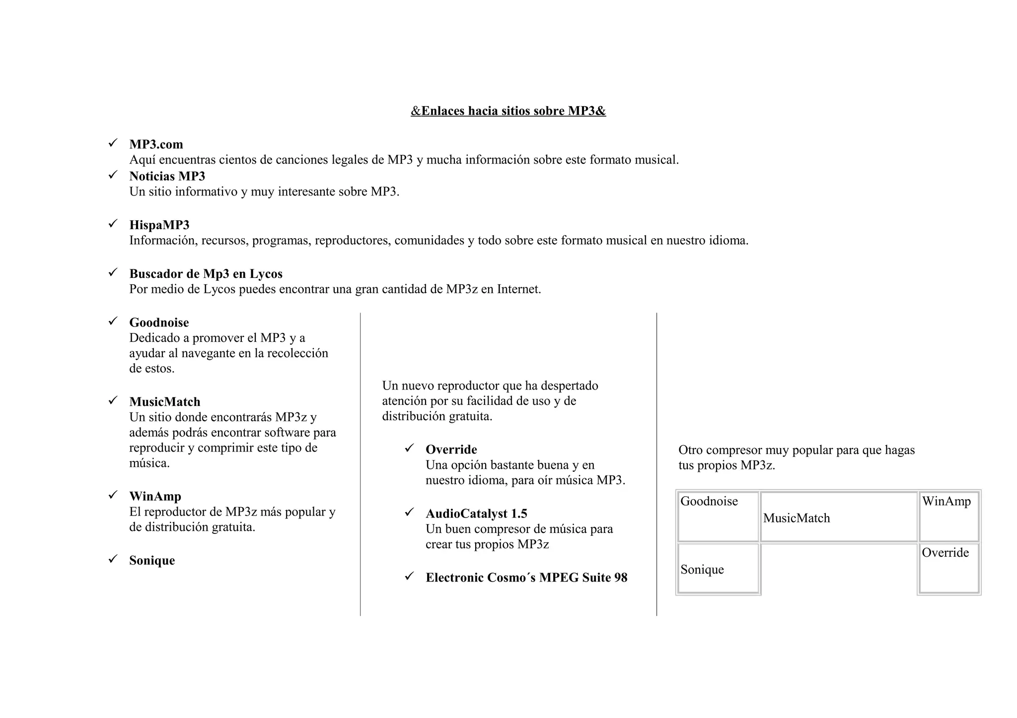 El documento lista recursos para encontrar y reproducir música en formato MP3, incluyendo sitios web con canciones MP3 legales como MP3.com y HispaMP3, buscadores de música MP3 como el de Lycos, y reproductores y compresores populares como WinAmp, MusicMatch, AudioCatalyst 1.5 y Electronic Cosmo's MPEG Suite 98.