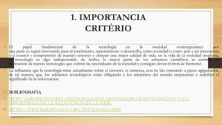 El documento describe la importancia de la tecnología en la sociedad y las empresas. Explica que la tecnología es fundamental para el desarrollo e innovación de una sociedad, y que permite mejorar la calidad de vida de las personas. También señala que las empresas que adoptan nuevas tecnologías son más competitivas y productivas, mientras que las que no invierten en tecnología se quedan rezagadas. Finalmente, concluye resaltando el papel fundamental de la tecnología en los procesos empresariales y la necesidad de su uso para mantener
