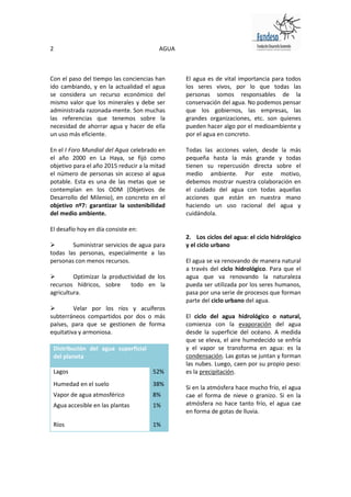 El documento describe los ciclos del agua, incluyendo el ciclo hidrológico natural y el ciclo urbano del agua. Explica que el agua se evapora de los océanos, se condensa en las nubes y luego llueve sobre la tierra, purificándose a través del ciclo. También describe cómo el agua es recolectada, almacenada y tratada en plantas de tratamiento de agua antes de ser distribuida a los hogares y negocios a través de redes de tuberías, completando así el ciclo ur