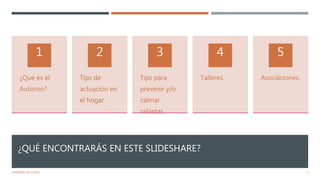 Este documento presenta información sobre el autismo, incluyendo una definición, consejos para el hogar como anticipar situaciones y reforzar conductas positivas, cómo prevenir y calmar rabietas, los beneficios de talleres como promover vínculos entre pares y disminuir estrés, y una lista de asociaciones de autismo en Andalucía.