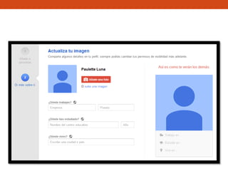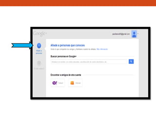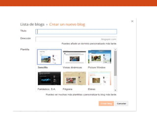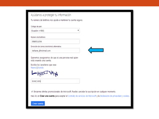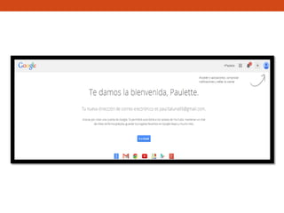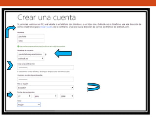 El documento proporciona instrucciones para crear cuentas de correo electrónico de Microsoft y Google, así como cuentas en Slideshare, Blogger y otros servicios. Explica los pasos básicos como ingresar datos de cuenta, crear una contraseña, y navegar a las bandejas de entrada u otras páginas después de crear con éxito las cuentas.