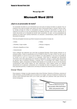 Este manual introduce Microsoft Word 2010 y sus funciones básicas. Explica que Word es un procesador de textos que permite crear y editar documentos de manera fácil. Describe la pantalla principal de Word y cómo iniciar el programa. Además, explica cómo ingresar y seleccionar texto, desplazarse por el documento y otros comandos básicos.