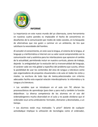 Este documento discute la importancia de la tecnología educativa y las TIC en las aulas. Señala que las TIC pueden ser herramientas útiles para satisfacer las necesidades de los estudiantes y enfrentar la complejidad de la enseñanza moderna. Sin embargo, también advierte que su uso ocasional no permite que maestros y estudiantes dominen plenamente estas herramientas y asuman nuevos roles. El documento concluye enfatizando la necesidad de que los maestros aprendan a aprovechar las TIC de manera que mot