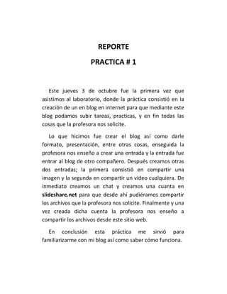 La primera práctica de informática consistió en crear un blog para subir tareas y materiales de clase. El estudiante aprendió a dar formato al blog, crear entradas compartiendo imágenes y videos, y usar SlideShare para compartir archivos con la clase. La práctica sirvió para familiarizarse con cómo funciona el blog.