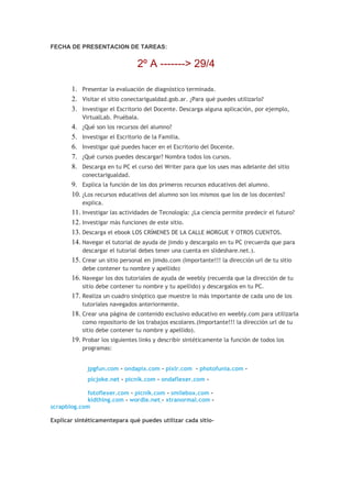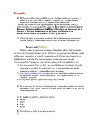 El documento presenta una lista de 17 tareas relacionadas con el uso de recursos educativos digitales como el Programa Conectar Igualdad y sitios web para docentes, alumnos y familias. Algunas tareas incluyen descargar programas como VirtualLab y Modellus para simulaciones, investigar el escritorio del docente y de la familia, crear sitios web, y explorar diferentes recursos educativos.