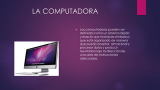 La computadora puede definirse como un sistema rápido y exacto que manipula símbolos y procesa datos bajo una serie de instrucciones. Se compone de hardware físico como la unidad central de procesamiento, memoria, unidades de almacenamiento y periféricos de entrada/salida, así como software lógico que permite ejecutar programas. Los principales componentes de hardware incluyen la tarjeta madre, microprocesador, memoria, disco duro y buses que permiten la comunicación entre componentes.