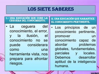 Este documento presenta un resumen de los Siete Saberes de Edgar Morin propuestos para una educación pertinente. Los siete saberes son: 1) una educación que cure la ceguera del conocimiento, 2) una educación que garantice el conocimiento pertinente, 3) enseñar la condición humana, 4) enseñar la identidad terrenal, 5) enfrentar las incertidumbres, 6) enseñar la comprensión, y 7) la ética del género humano.
