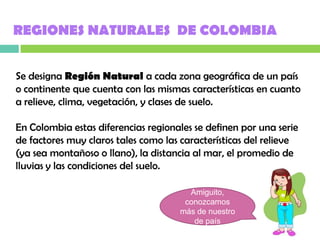 El documento describe las 6 regiones naturales de Colombia - la Región Amazónica, la Región Andina, la Región Caribe, la Región Insular, la Región de la Orinoquía y la Región Pacífica. Define cada región por su ubicación geográfica, características del relieve, clima, ríos y otros aspectos naturales. El propósito es presentar las diferentes zonas geográficas de Colombia y las características distintivas de cada una.