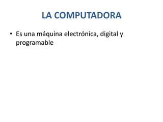 La computadora es una máquina electrónica, digital y programable que recibe datos como entrada, los procesa y genera una salida, y está compuesta por hardware físico como la placa madre y software como el sistema operativo.