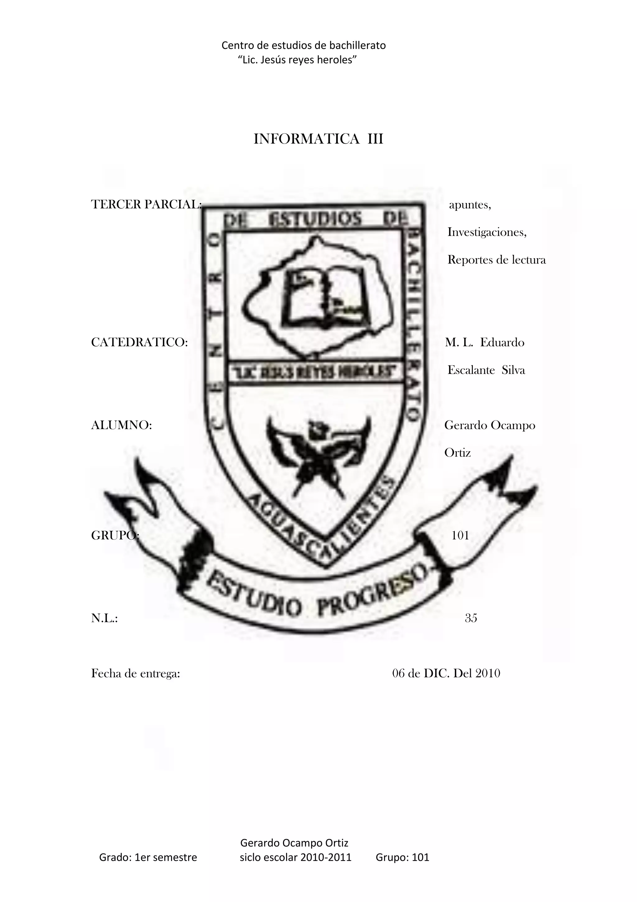 Este documento presenta los apuntes de la clase de Informática III para Gerardo Ocampo Ortiz del primer semestre del ciclo escolar 2010-2011 en el Centro de Estudios de Bachillerato "Lic. Jesús Reyes Heroles". Los temas cubiertos incluyen monitores, impresoras, periféricos de soporte, IBM, MS-DOS, programas de aplicación, virus e investigaciones sobre la historia del internet y riesgos en internet. También incluye reportes de lectura sobre varios temas relacionados con la tecnología.