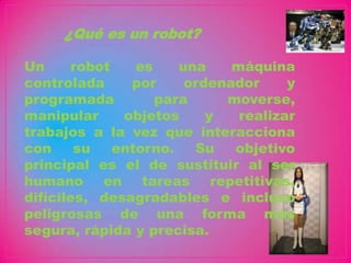 Un robot es una máquina programada para moverse y manipular objetos de forma autónoma. Está diseñado para realizar tareas repetitivas, difíciles o peligrosas en lugar de los humanos. Los robots industriales modernos tienen brazos articulados, efectores terminales, actuadores eléctricos, unidades de control y sensores. Se utilizan en una variedad de aplicaciones industriales como la soldadura automotriz.